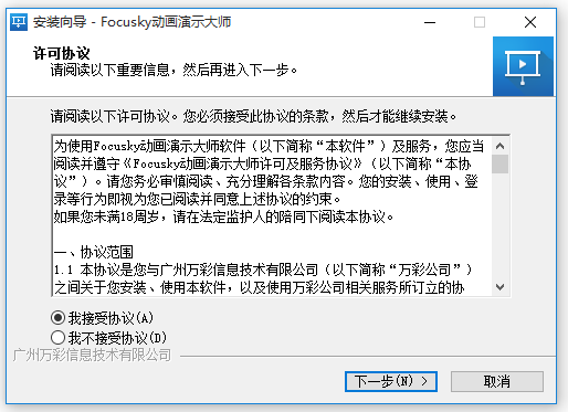下載Focusky動(dòng)畫演示大師,解壓壓縮包,雙擊.exe文件,彈出界面,閱讀協(xié)議并接受,進(jìn)行下一步,