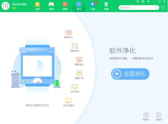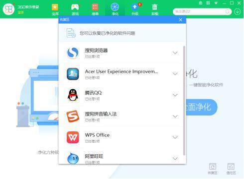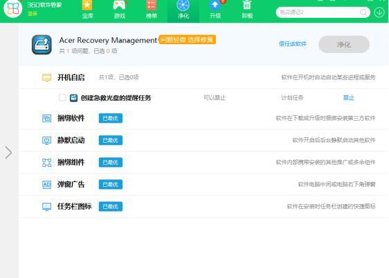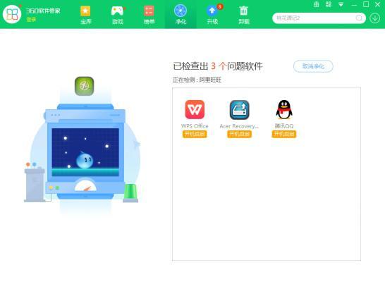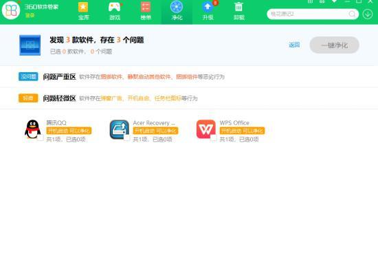 點擊“全面凈化”按鈕后,掃描功能正式啟動,一番掃描后,筆者電腦中的軟件被反饋出如下問題,還算比較輕微。