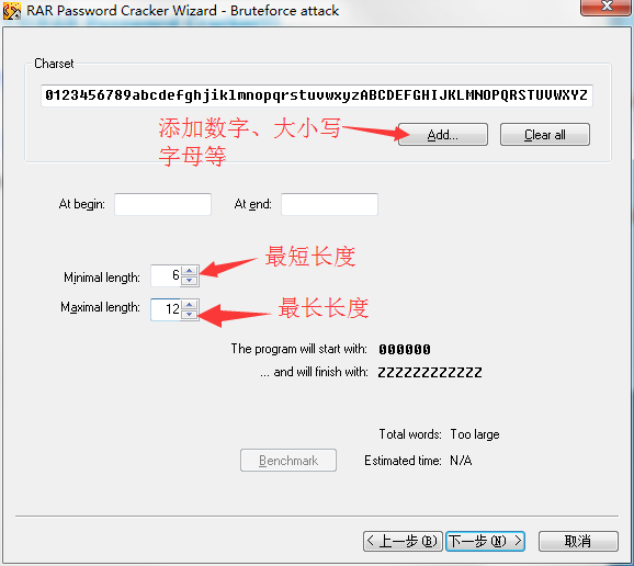 6.在“暴力破解”設(shè)置界面,用戶需要根據(jù)自己設(shè)置密碼的習(xí)慣設(shè)置密碼特征,包括“大寫字母”、“小寫字母”、“數(shù)字”三種,單擊“添加”按鈕即可添加字符串,在中間的設(shè)置框內(nèi)設(shè)置密碼的長度。單擊“下一步”按鈕。
