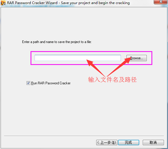 7.之后單擊“瀏覽”按鈕設(shè)置破解方案文件的保存位置和名稱,在以后破解時(shí)會(huì)自動(dòng)使用這一套方案。確認(rèn)下方的“運(yùn)行RAR Password Cracker”處于選中狀態(tài),單擊“完成”按鈕。