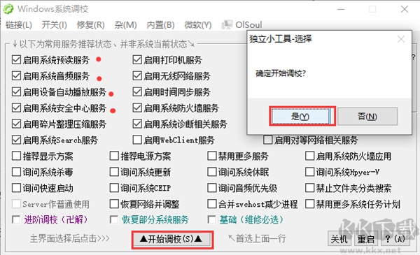 打開(kāi)軟件后,勾選你想調(diào)節(jié)的服務(wù)選項(xiàng),點(diǎn)擊“開(kāi)始調(diào)校”,然后選擇“是”確認(rèn)。