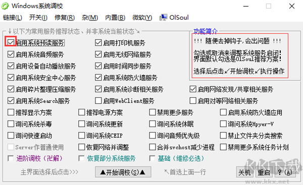 隨意取消某些選項(xiàng)可能會(huì)導(dǎo)致系統(tǒng)異常,軟件默認(rèn)勾選的是OISoul推薦的最佳設(shè)置,你可以根據(jù)提示勾選恢復(fù)來(lái)嘗試修復(fù)問(wèn)題。