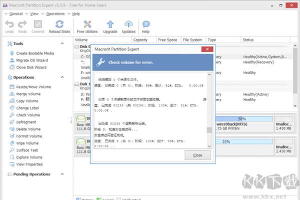 我們可以借助MPE掃描并修復硬盤的邏輯壞道,比如很多邏輯壞道位于硬盤的系統(tǒng)分區(qū)上,它可以直接掃描系統(tǒng)分區(qū)(Windows 10自帶組件則只能在重啟并再次進入系統(tǒng)前掃描)。同上選中需要掃描的硬盤,接著在其分區(qū)列表中選擇需要掃描的分區(qū),點擊左側(cè)窗格的“Operations→Check volume”,激活掃描組件后進行掃描和恢復即可(圖5)。