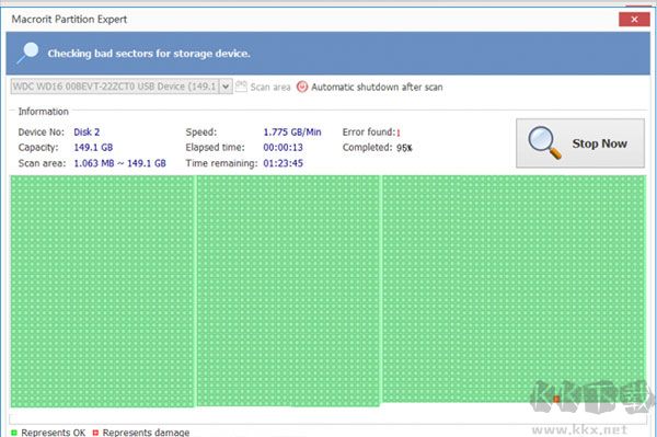 – 分區(qū)表面測試:掃描分區(qū)(選擇掃描區(qū)域)檢查并查找壞扇區(qū)