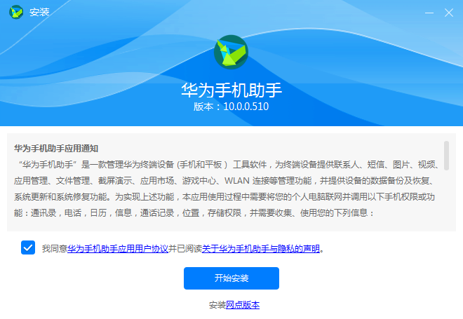1、將kk下載分享的HiSuite壓縮包解壓出來,雙擊setup.exe文件進(jìn)行安裝,勾選同意,點(diǎn)擊【開始安裝】;
