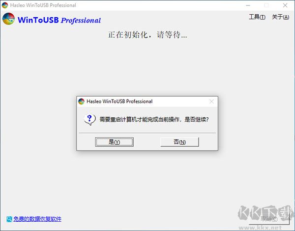 7、成功創(chuàng)建WinPE后,WinToUSB將提示是否重啟,請(qǐng)點(diǎn)擊“是”按鈕允許重啟計(jì)算機(jī)。