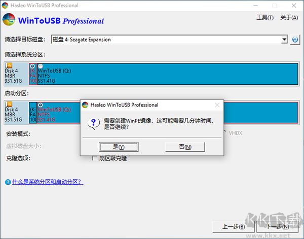 6、點(diǎn)擊“下一步”按鈕,WinToUSB將詢問是否創(chuàng)建WinPE,點(diǎn)擊“是”。
