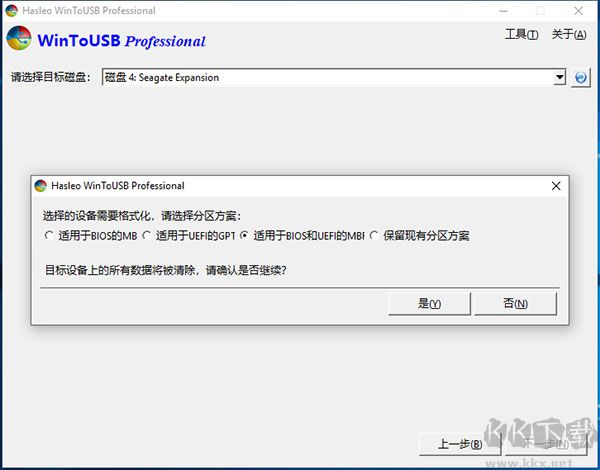 4、WinToUSB 彈出窗口詢問是否需要格式化目標(biāo) USB 設(shè)備以繼續(xù)執(zhí)行安裝,選擇您想要使用的分區(qū)方案然后點(diǎn)擊“是”按鈕格式化驅(qū)動(dòng)器。如果選擇“保留現(xiàn)有分區(qū)方案”,您需要在執(zhí)行該步驟之前手動(dòng)準(zhǔn)備目標(biāo)驅(qū)動(dòng)器上的分區(qū),這兒是如何為 WinToUSB 創(chuàng)建目標(biāo)分區(qū)的指南。請(qǐng)注意“保留現(xiàn)有分區(qū)方案”選項(xiàng)只對(duì)移動(dòng)硬盤有效。