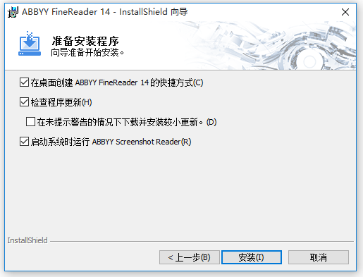 ABBYY FineReader 14玄裝程序正在準(zhǔn)備Installshield向?qū)?該向?qū)⒅笇?dǎo)您完成安裝過程請稍候。