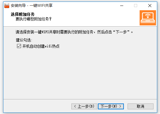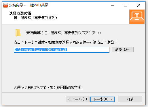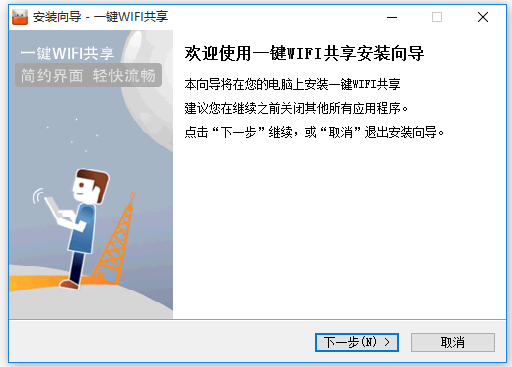 歡迎使用- -鍵WIFI共享安裝向?qū)П鞠驅(qū)⒃谀碾娔X上安裝一鍵WIFI共享建議您在繼續(xù)之前關(guān)閉其他所有應(yīng)用程序。點(diǎn)擊“下一步”繼續(xù),或“取消”退出安裝向?qū)А?/p>