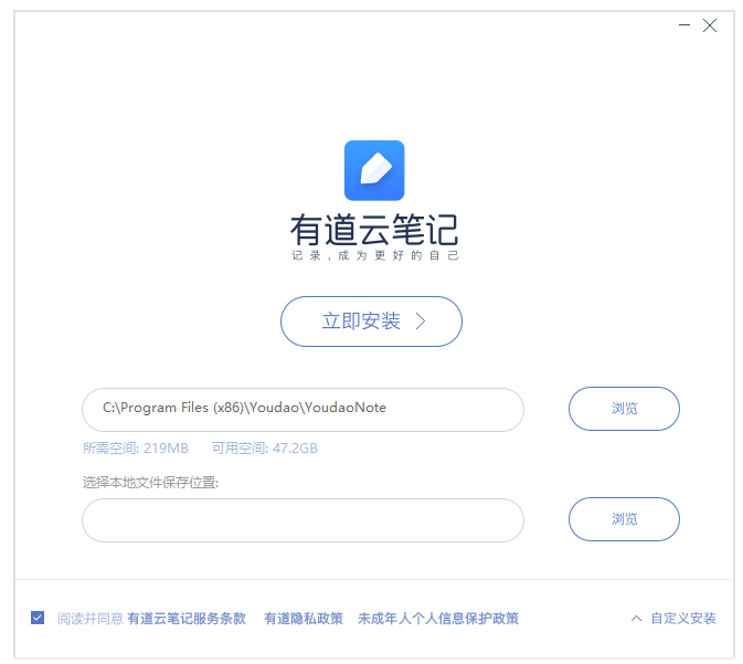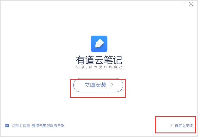 1.到本站下載有道云筆記,解壓壓縮包,雙擊.exe文件,彈出界面,閱讀條款協(xié)議并同意,點(diǎn)擊【自定義安裝】,