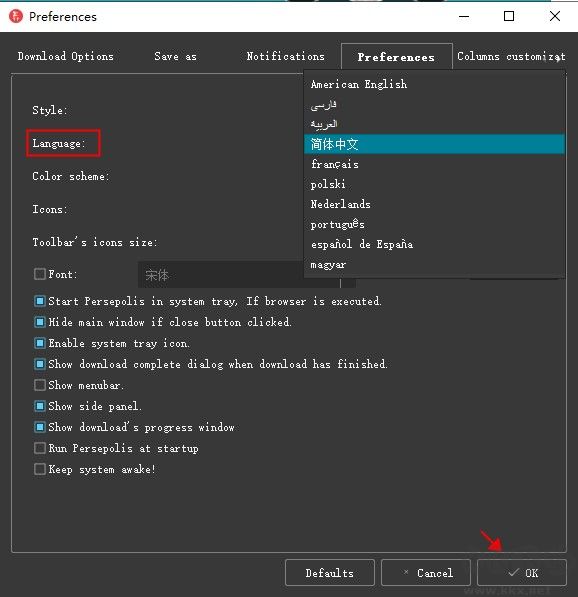 2、在彈出窗口中找到language,在下拉欄中找到簡(jiǎn)體中文并選擇,點(diǎn)擊ok。
