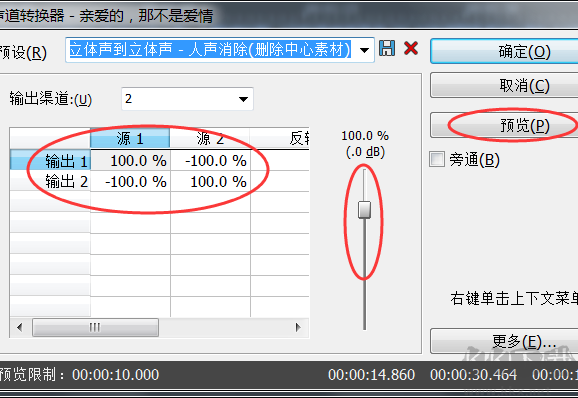 Sound Forge預(yù)設(shè)里的“人聲消除”選項(xiàng)只能簡(jiǎn)單的降低人聲,為了將歌曲制作成伴奏,還需要自己手動(dòng)調(diào)試優(yōu)化。如圖4所示,在“聲道轉(zhuǎn)換器”中,可以通過點(diǎn)擊“預(yù)覽”按鈕來試聽當(dāng)前效果下的歌曲片段。