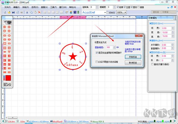 8、等所有的屬性都設(shè)置完成后,印章就只做成功了,我們點(diǎn)擊界面上方的Word或者Excel選項(xiàng),然后設(shè)置發(fā)送方式和圖像的精度,設(shè)置完成后點(diǎn)擊開(kāi)始發(fā)送就可以將設(shè)置好的圖章模板發(fā)送到Word或者Excel里。