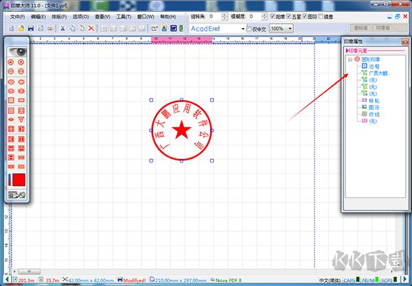 5、邊框?qū)傩栽O(shè)置完成后,我們?cè)僭O(shè)置邊框下方的T1標(biāo)志,雙擊T1選項(xiàng)進(jìn)入文字1編輯界面,此界面是編輯印章內(nèi)的文字,我們可以把廣西大鵬幾個(gè)字隨意更改。用戶還可以設(shè)置尺寸等屬性,設(shè)置完成后雙擊文字內(nèi)容就可以回到編輯主界面。