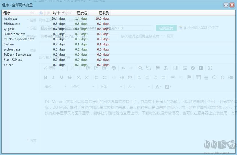 流量監(jiān)控網(wǎng)上并不多,找來找去都是比較簡單的,要么就是非常復(fù)雜的抓包工具,想看一下某個(gè)IP或是程序消耗了多少流量也困難!好了,有了IP流量監(jiān)控軟件DU Meter這款專業(yè)級(jí)別的軟件,什么事情都不用擔(dān)心了,你不但可以使用在家用電腦上,也可以在服務(wù)器IIS環(huán)境下使用!解決了小編的大難題,KK下載站小編給大家提供的是破解綠色便攜版本,解壓即可使用!