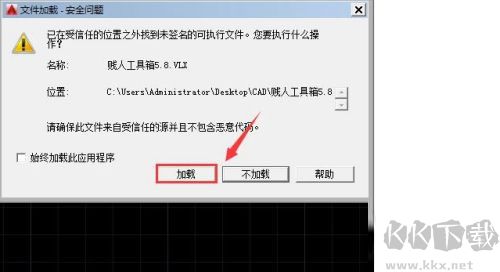 4、再舉一個(gè)例子,如果你的工具箱放在D盤123目錄下,那這句話應(yīng)改成(load "D:\\123\\賤人工具箱。vlx)