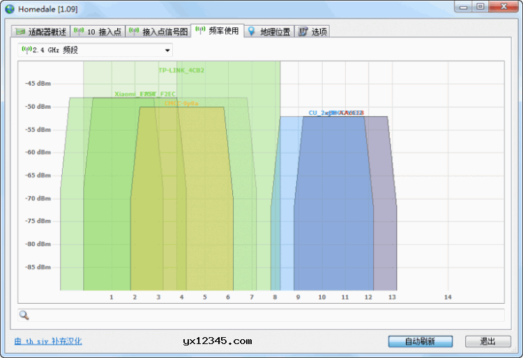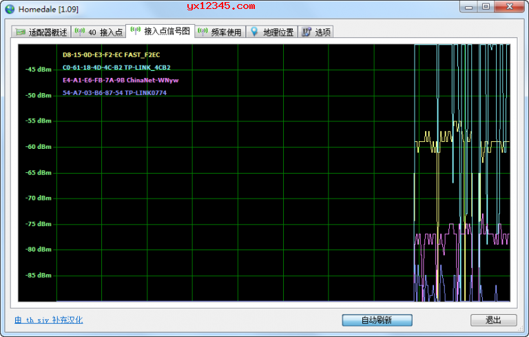Homedale中文版是一款無線網(wǎng)絡(luò)監(jiān)視器(無線網(wǎng)絡(luò)檢測工具)使用這款工具可以檢測附近無線網(wǎng)絡(luò)和狀態(tài)和強度,該工具除了顯示諸如基礎(chǔ)架構(gòu)模式、信道和支持的比特率等技術(shù)信息外,還包括一個信號圖,使您可實時監(jiān)視多個接入點的信號強度。并且使用 Homedale 您可掃描 Wi-Fi/WLAN 接入點并監(jiān)控其信號強度。詳細信息窗口可顯示所有“信息元素”及其解碼數(shù)據(jù)。有需要的朋友可以下載試試。