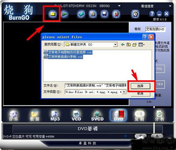 2、在刻錄機插入空白的DVD-R盤片,然后點擊頂部的【文件夾】按鈕可以導(dǎo)入您要刻錄的VOB格式的視頻文件??梢远噙x。您也可以用拖拽方式把VOB文件扔到刻錄界面里;