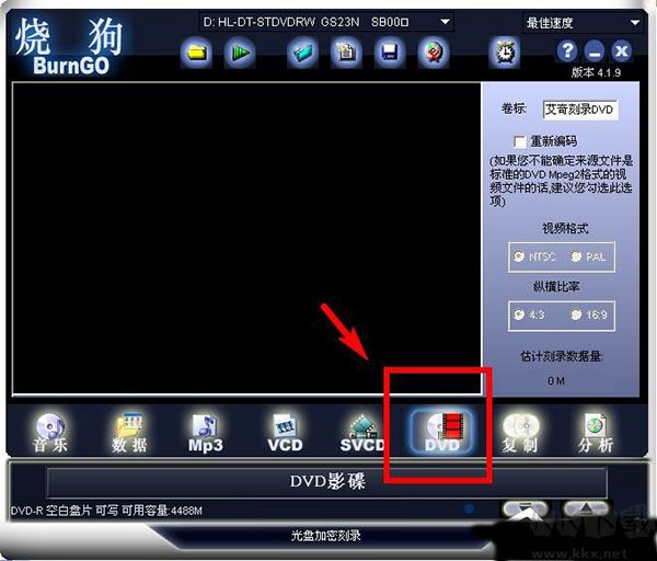 1、運行《燒狗刻錄》軟件,點擊下方的【DVD】按鈕,進入DVD刻錄狀態(tài)。這時請把右側(cè)的【重新編碼】勾選去掉,因為軟件的編碼功能并不完善。用艾奇軟件輸出的VOB格式已經(jīng)完全附和刻錄要求無需再做編碼;