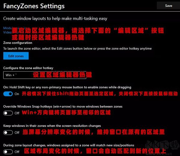 2、其中做的比較成熟的,是這個(gè)叫 Fancy Zones 的多任務(wù)視窗工具,它能創(chuàng)建合理的窗口布局,幫助用戶在開(kāi)啟多個(gè)窗口的時(shí)候,能有條理的來(lái)掌控桌面。