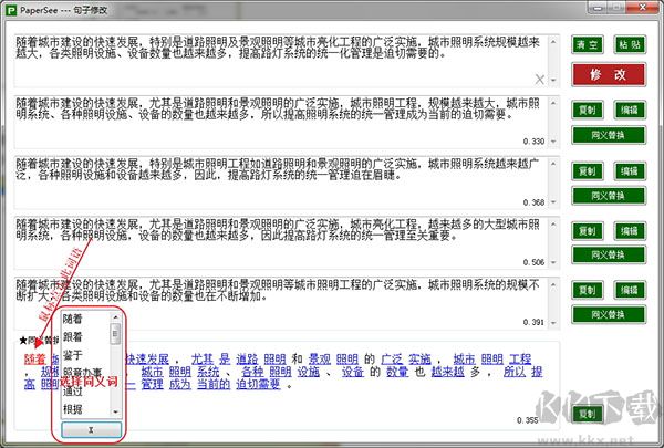 很多在撰寫(xiě)論文中沒(méi)有思路,這是寫(xiě)不好論文的最大原因,而這個(gè)助手對(duì)于每一個(gè)需要修改的句子,可以提供四個(gè)句子修改選項(xiàng),方便用戶根據(jù)自己的需要進(jìn)行選擇。