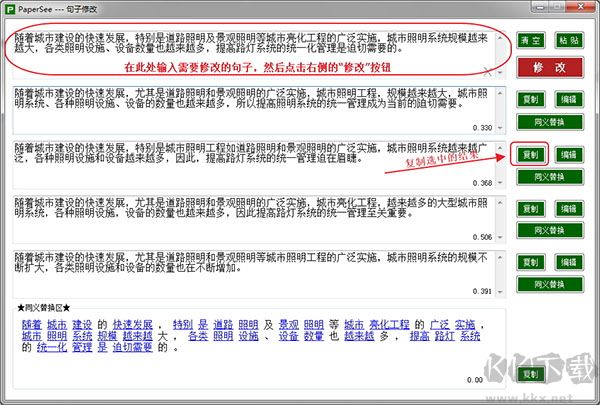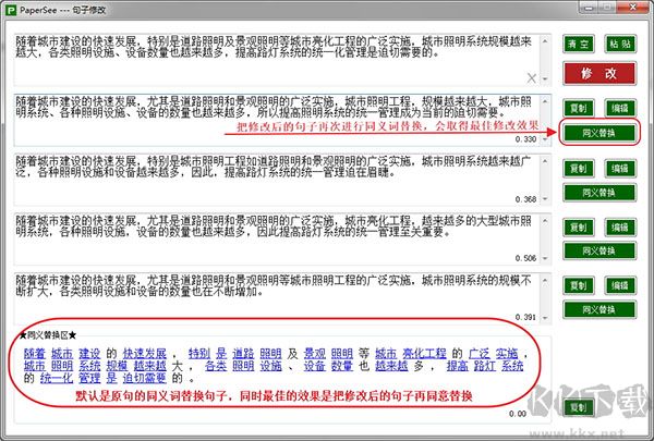 論文查重后一般多少都有一定的重復(fù)率,這時(shí)候就需要把重復(fù)的句子進(jìn)行修改,如果你想提高工作效率、拓展思路的話,建議你使用我們的論文修改助手,此軟件可以把一個(gè)句子改造成四個(gè)句子,供你選擇。