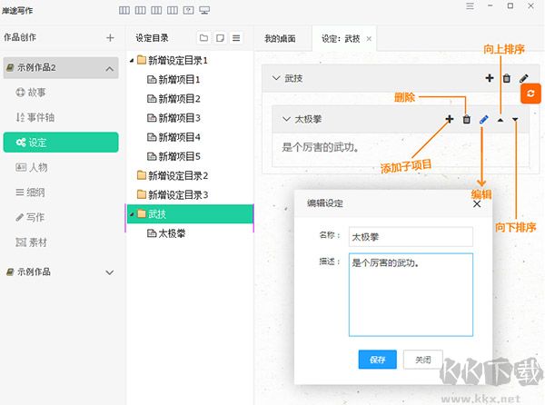 提供作品的武技、裝備、派系、種族、國度、職業(yè)等作品設定管理。