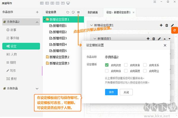 設定文檔提供關于作品的相關設定的管理。設定最多提供三級設定,系統(tǒng)還提供了系統(tǒng)默認模板。