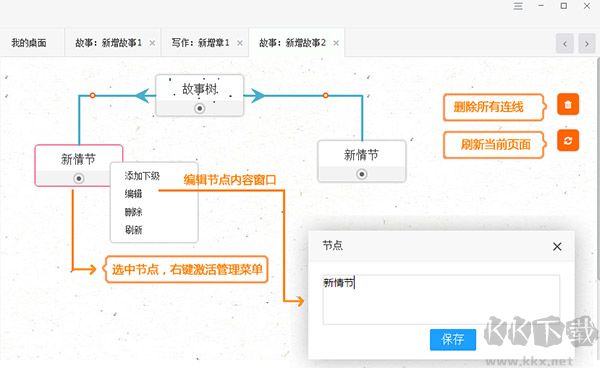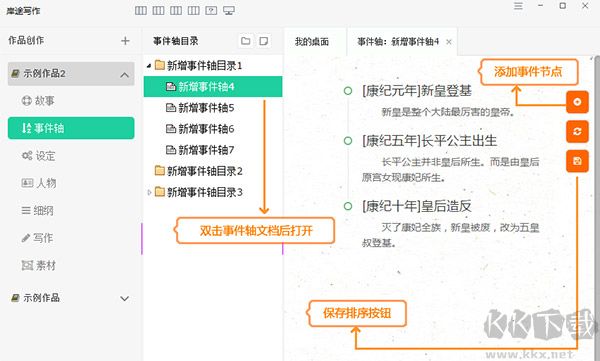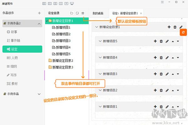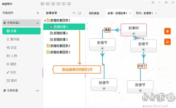 軟件提供了故事、事件軸、設定、人物、細綱、寫作窗口以及素材等面向長篇小說構(gòu)思、創(chuàng)作以及寫作的諸多文檔能力。