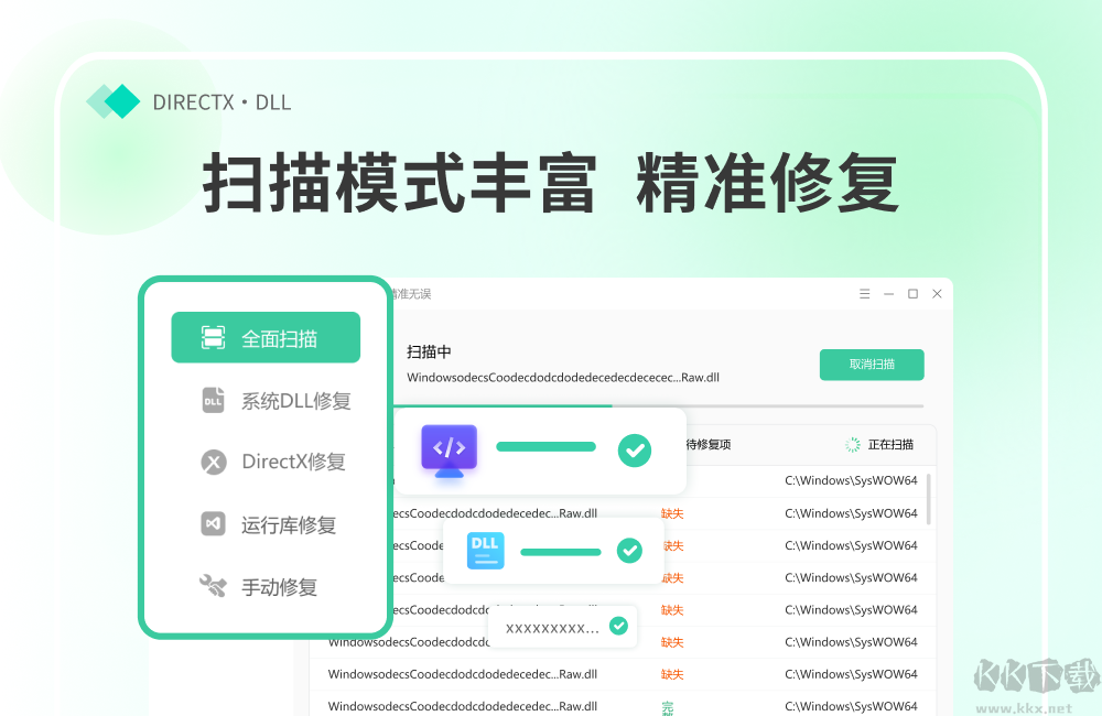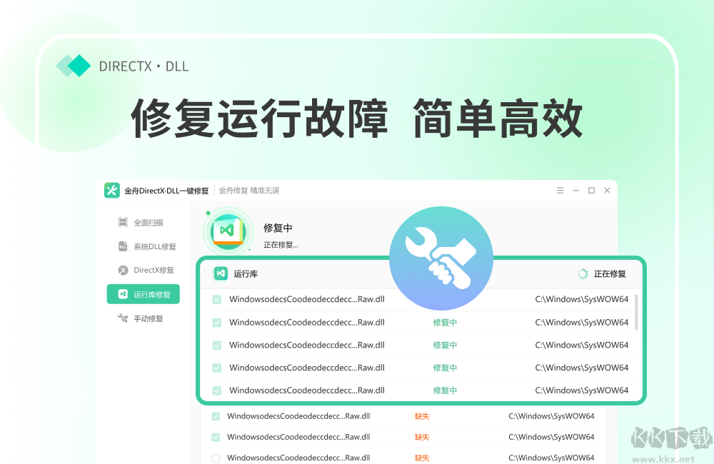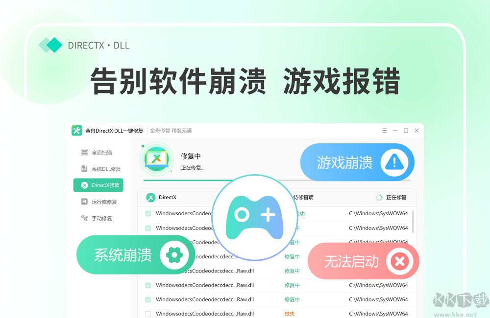 金舟DirectX·DLL一鍵修復(fù)升級(jí)版是一款操作起來非常簡單,好用系統(tǒng)修復(fù)軟件,這款軟件內(nèi)為用戶提供了全面掃描,DirectX,運(yùn)行庫,系統(tǒng)DLL,手動(dòng)修復(fù)五種模式,有了這款軟件,用戶就能迅速定位并修復(fù)電腦中出現(xiàn)的問題,感興趣或者有需要的小伙伴就快來kk網(wǎng)站下載體驗(yàn)一下吧。