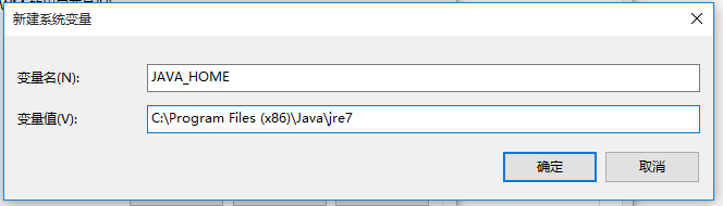 如圖,在【系統(tǒng)變量】下點擊【新建】,彈出對話框,變量名為【JAVA_HOME】,變量值是指安裝JDK的路徑,小編安裝在C:\Program Files (x86)\Java\jre7,點擊確定,