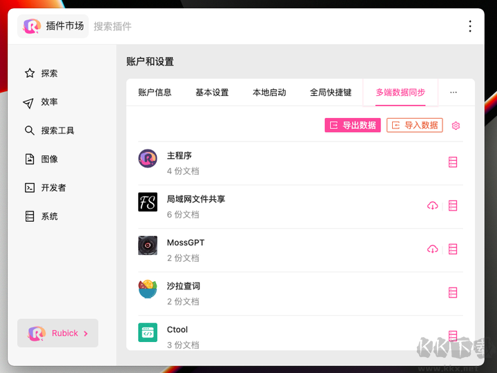 在 ubick內(nèi)搜索偏好設(shè)置進入賬戶和設(shè)置->多端數(shù)據(jù)同步;即可 rubick插件使用數(shù)據(jù)進行導出和導入。