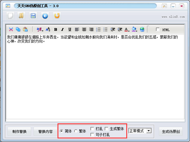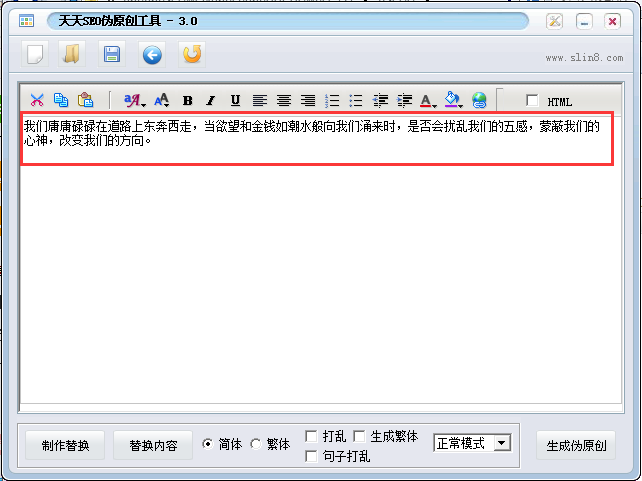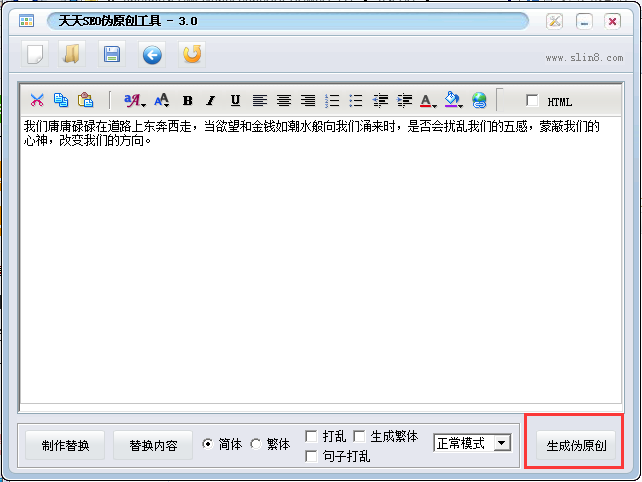 天天SEO偽原創(chuàng)工具是一款非常不錯的內(nèi)容優(yōu)化工具,大家都知道在網(wǎng)站運營上內(nèi)容多么重要,可是原創(chuàng)太難!所以偽原創(chuàng)就出現(xiàn)了,并且有了SEO偽原創(chuàng)工具可以快速幫助站長、編輯實現(xiàn)文章原創(chuàng)。天天SEO偽原創(chuàng)工具它能夠?qū)⒕渥雍投温漤樞虼騺y,替換詞句,從而避免大批量飄紅,支持添加文章中的關鍵詞錨文本,有利于搜索引擎快速收錄文章。