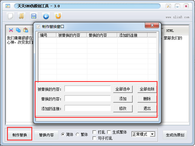 1、新建一個空白文字,將復制的文字粘貼到文本編輯區(qū)域 2、點擊制作替換內(nèi)容,輸入被替換的內(nèi)容以及替換的內(nèi)容,設置需要添加的鏈接 3、選擇替換內(nèi)容 4、自由選擇打亂、生成繁體等方式 5、點擊生成偽原創(chuàng),文章即可使用了