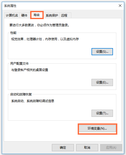 進(jìn)入系統(tǒng)屬性頁(yè)面,點(diǎn)擊【高級(jí)】——【環(huán)境變量】,
