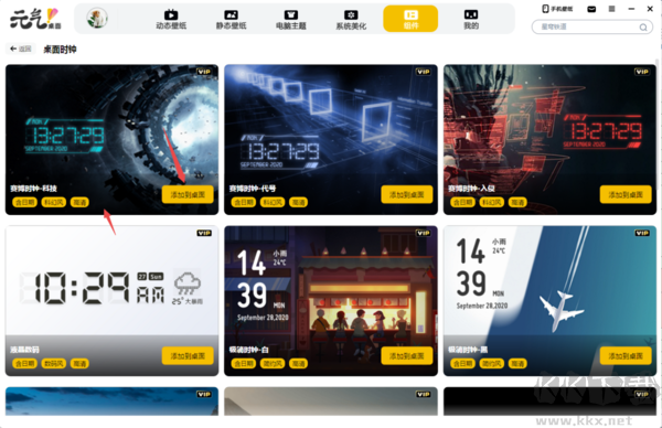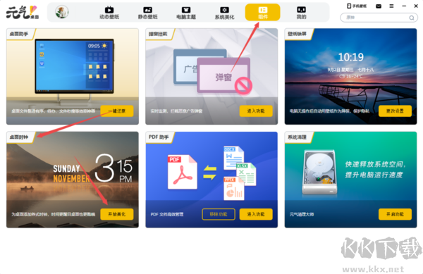 1、啟動(dòng)軟件,點(diǎn)擊【組件】選項(xiàng),然后找到【桌面時(shí)鐘】選項(xiàng),點(diǎn)擊【開始美化】按鈕。