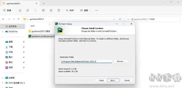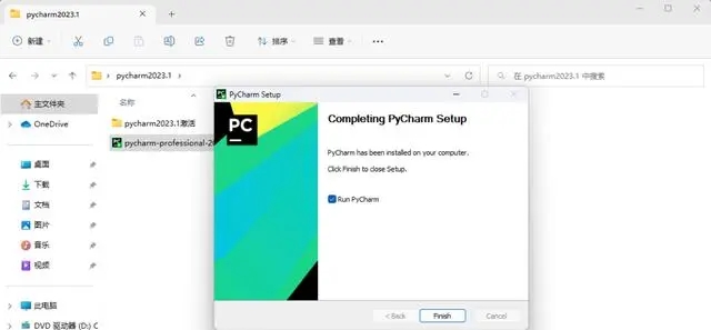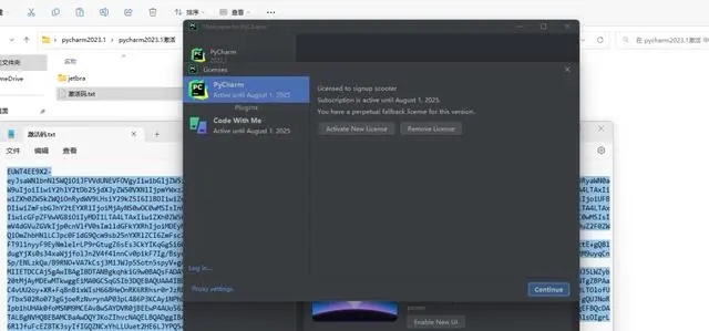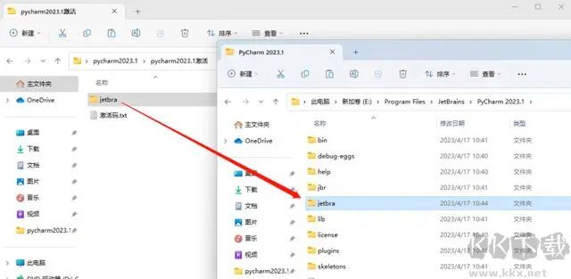 10、解壓下載得到的“Pycharm2023.1激活.zip”,進入文件夾,里面有個“jetbra”文件夾和一個“激活碼.txt”文件,把jetbra文件夾復制到某個沒有中文且沒有其他非法字符的路徑下,注意,以后不能修改它的位置,否則激活失效。比如說我這里把它復制到Pycharm的安裝目錄下