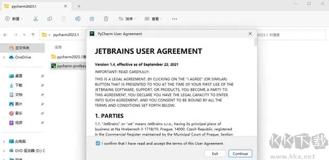 7、首次打開Pycharm,它會彈出一個用戶協(xié)議,我們勾選左下角的“I confirm that I have read...”,然后點擊右下角的Continue