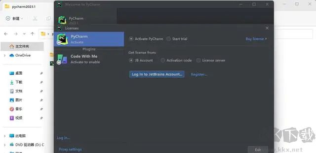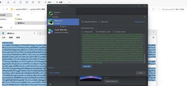 13、現在重新打開Pycharm,如果之前沒有關閉,一定要先重啟一下,然后點擊“Activation code”,把之前解壓得到的“激活碼.txt”文檔里的激活碼復制到Pycharm的輸入框里,點擊“Active”即可激活