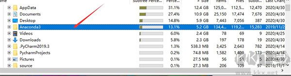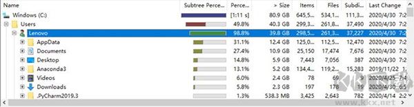 4、目錄樹模式中也配置多種統(tǒng)計方式,分析之后,你可以看到每個文件夾的體積、目錄下配置多少文件、與每個文件夾占用空間的百分比。