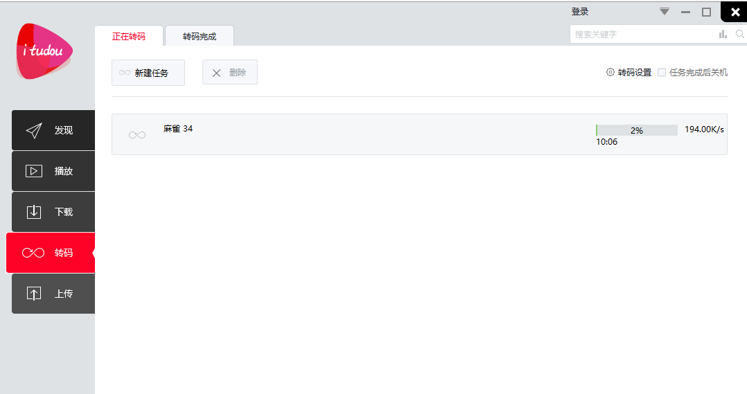 打開itudou播放器,選擇一個(gè)已經(jīng)下載好的視頻,點(diǎn)擊【轉(zhuǎn)碼】,如下圖,
