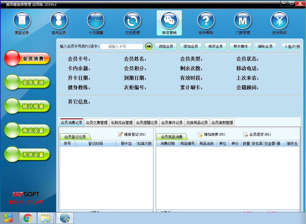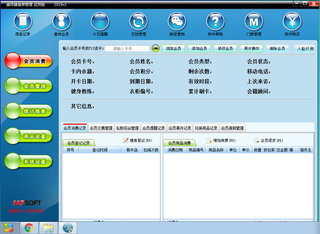 美萍健身房管理系統(tǒng)是一款轉(zhuǎn)為健身房、健身會(huì)所一類(lèi)的俱樂(lè)部打造的會(huì)員管理軟件,支持會(huì)員管理、私教管理、健身教練管理、門(mén)禁管理等多種管理服務(wù)。在這里系統(tǒng)中國(guó)還加入硬件支持,如:接觸式IC卡、M1卡、條碼槍、POS錢(qián)箱、POS小票打印機(jī)、磁條卡讀卡器、ID卡讀卡器等,方便俱樂(lè)部更好的進(jìn)行會(huì)員管理!