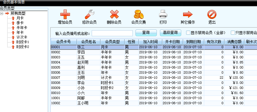 3.進(jìn)入“會(huì)員管理”,這里包含了所有會(huì)員的全部信息,你可以進(jìn)行增加會(huì)員、修改會(huì)員、會(huì)員交費(fèi)等操作