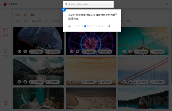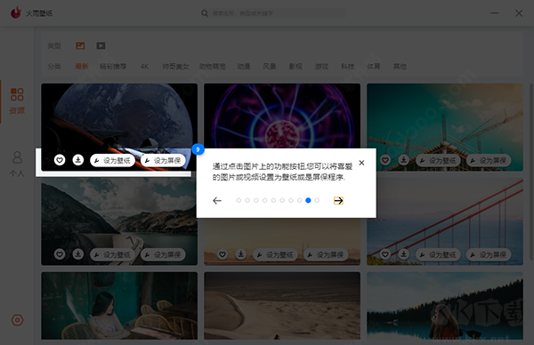 9、在主界面中火雨壁紙中的資源會以縮略圖的方式來進行展示,單擊可配合到單個資源預(yù)覽模式;