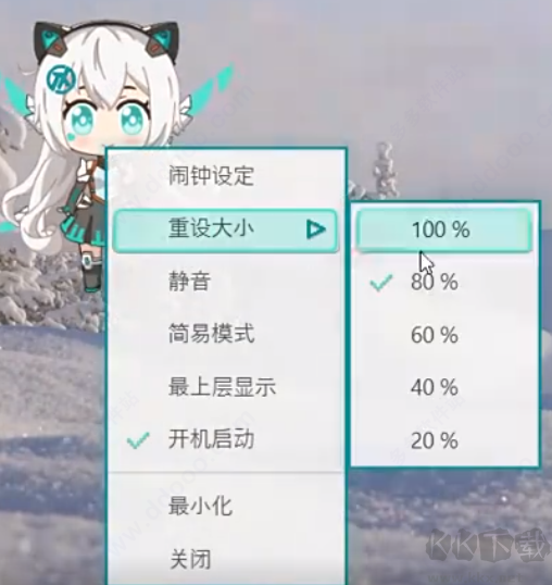 9、在桌面狀態(tài)下,右鍵選擇天選桌寵,可以對(duì)天選姬進(jìn)行形象上的細(xì)節(jié)調(diào)整,比如顯示的大小比例,如果暫時(shí)不需要天選姬用“完整形象”現(xiàn)身,可以選擇“簡(jiǎn)易模式”,天選姬就會(huì)變成簡(jiǎn)易的圖標(biāo),需要隱藏的話,選擇“最小化“即可把天選姬隱藏到狀態(tài)欄中。