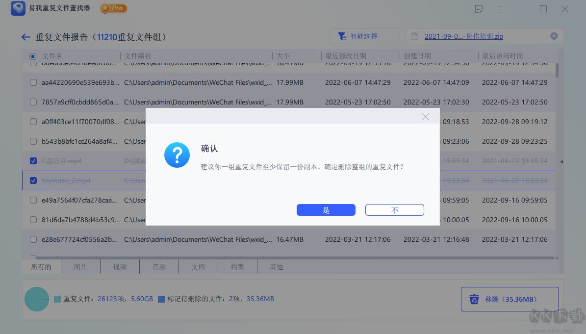 當(dāng)選擇一組所有的重復(fù)文件時,會出現(xiàn)“建議你一組重復(fù)文件至少保留一份副本。確定刪除整組的重復(fù)文件?”的提示。