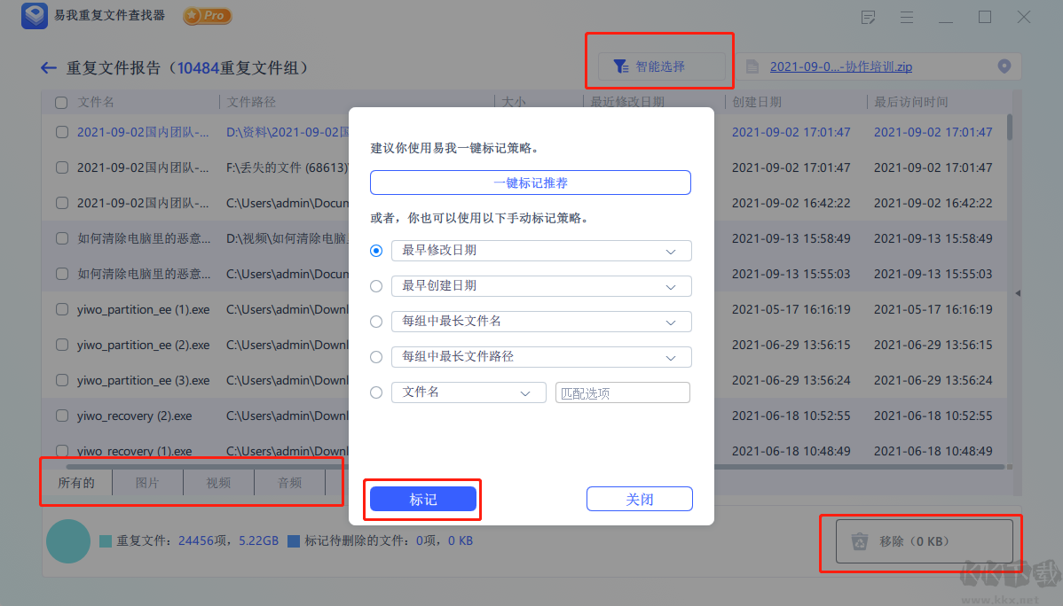 在「重復(fù)文件報(bào)告」頁面中,會顯示出所有重復(fù)文件,可根據(jù)文件類型更準(zhǔn)確選擇自己要刪除的文件,同時也能在「智能選擇」中使用「一鍵標(biāo)記策略」和「手動標(biāo)記策略」來確定刪除的文件,標(biāo)記后點(diǎn)擊右下角「移除」并選擇對應(yīng)選項(xiàng)。