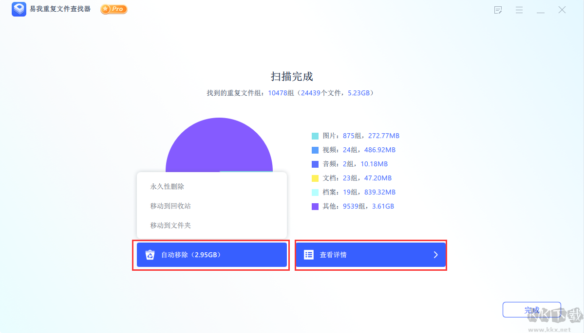 掃描完成后,會出現(xiàn)掃描完成界面,可直接點(diǎn)擊「自動移除」,會出現(xiàn)永久性刪除、移動到回收站、移動到文件夾三個選項(xiàng),請根據(jù)自己的需求選擇;也可點(diǎn)擊「查看詳情」進(jìn)入「重復(fù)文件報(bào)告」頁面。