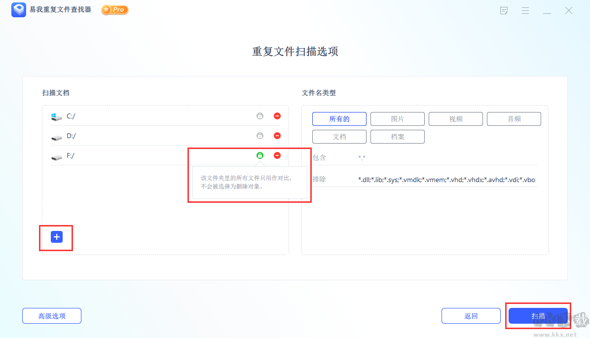 2)在重復(fù)文件掃描選項(xiàng)頁面中,點(diǎn)擊「+」按鈕可以選擇要掃描的文件夾或磁盤,點(diǎn)擊掃描文檔列表中右側(cè)「“鎖”」圖標(biāo),則表示該磁盤文件只做對比而不會被選作刪除對象,如果不想對掃描列表中某個磁盤或文件夾進(jìn)行掃描,點(diǎn)擊「Θ」按鈕去掉即可,在「文件名類型」中也可以根據(jù)自己的需求進(jìn)行選擇,完成后點(diǎn)擊「掃描」。